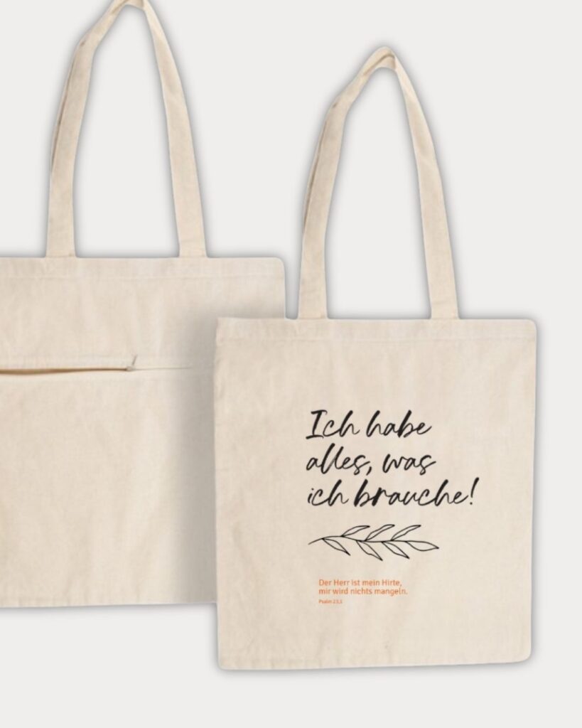Praktisch und mit liebevollem Druck als Erinnerung an Gottes Versorgung. Die Pocket Tasche mit Reißverschluss sorgt dafür, dass Schlüssel und Portmonnaie leicht zugänglich bleiben.