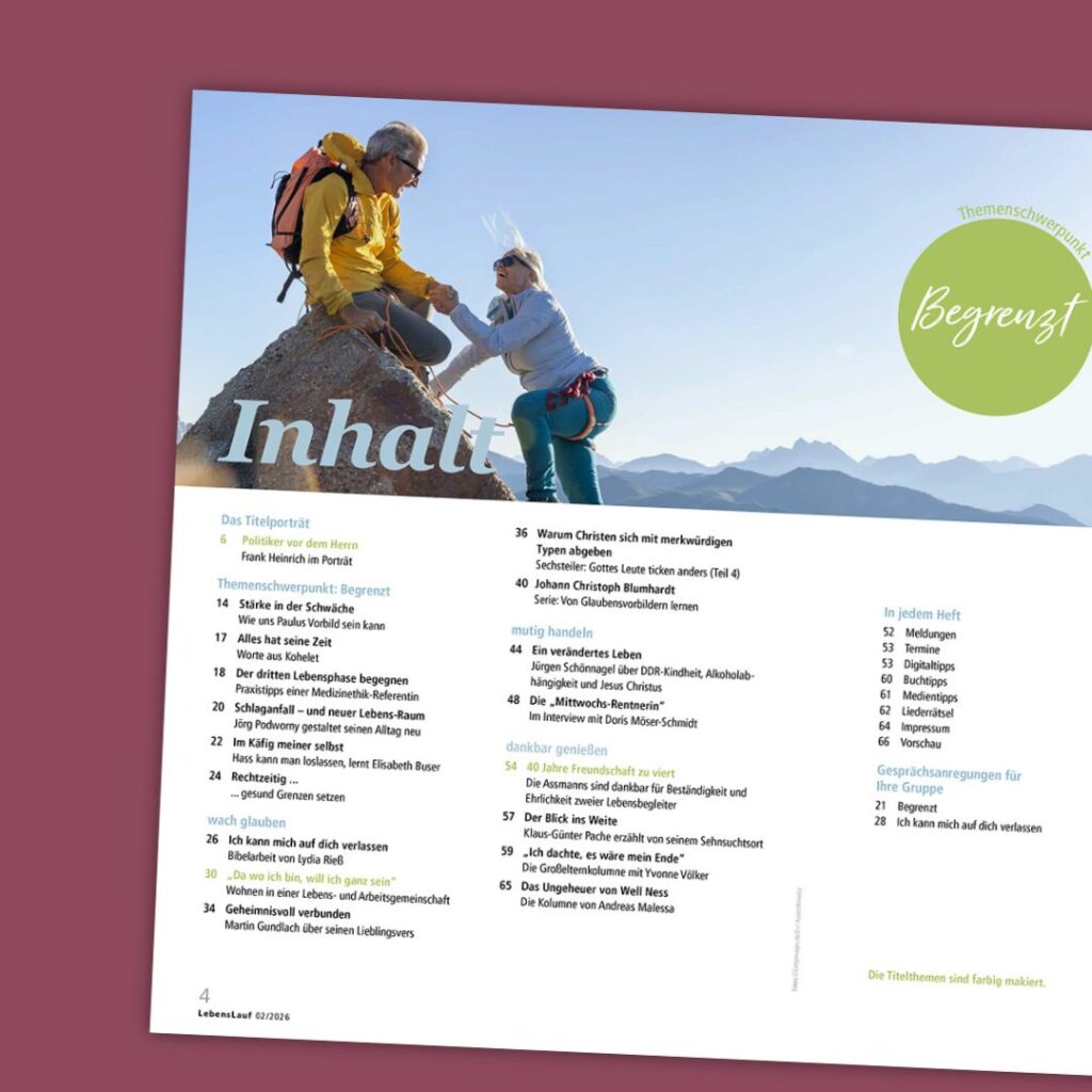 LebensLauf ist die Zeitschrift für alle, die auch im Älterwerden wach glauben, mutig handeln und dankbar genießen wollen. Viermal im Jahr wird inspiriert das Heft, den Glauben weiter zu bauen.