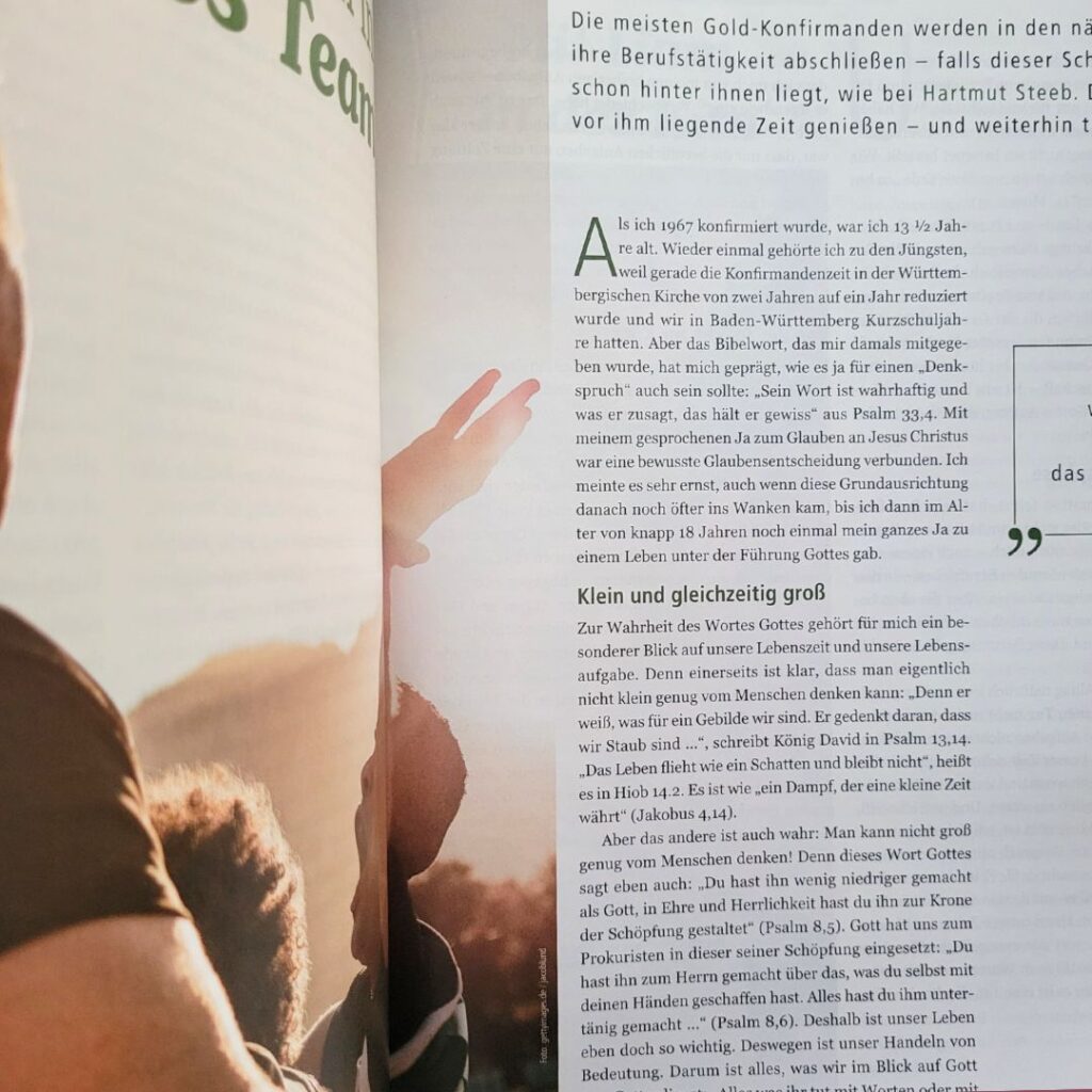 Ein Heft sich zu erinnern, Bilanz zu ziehen und einen Ausblick in die Zukunft zu wagen. Das attraktive Magazin beinhaltet Themen wie „Wie sah die Welt Anfang der 70er aus?“ oder „Wie verändert sich der Glaube mit den Jahren?“. Ein perfektes Geschenk für alle Gold-Konfirmanden.